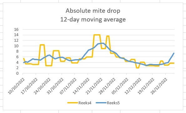 I determine the Varroa pressure solely by counting mites on the bottom board. Hence, the natural mite drop, determined over a long period, from the beginning of autumn to deep winter, and also from the beginning of the year to late spring. I convert the counting results into the average mite fall per day. There appear to be large fluctuations, resulting in an erratic curve. That is why I also calculate the 12-day moving average and the cumulative mite fall over the entire counting period. These values give a much more reliable picture of the dynamics of the mite population. This makes differences between colonies more clearly visible.