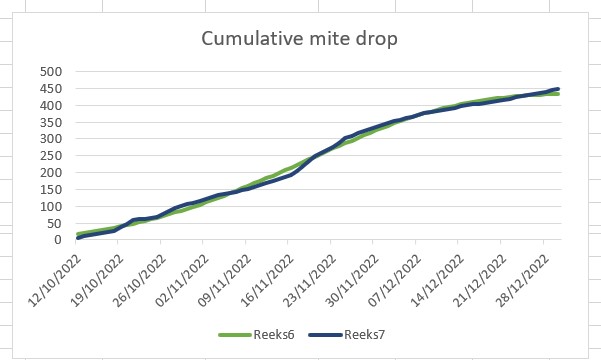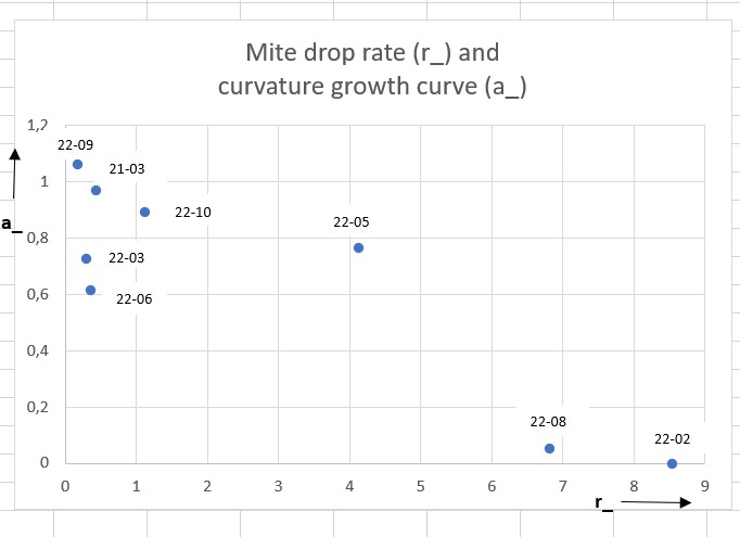 The cumulative mite drop generally shows an S-shape, as we often see in nature. After a slow start, a more or less steep slope follows, which eventually flattens out again. In some colonies the curve is linear, so a straight line, without flattening. Still other colonies show an exponential curve, leading to an explosion of mites. Colonies with these kinds of curves drop out for propagation.