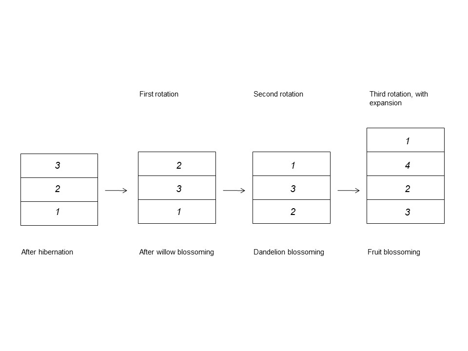 The crux of the method resides in choosing the proper moment and the frequency of the chamber reversals. As is often the case in beekeeping, various authors have different opinions about this. According to Bretschko, the first reversal (or rotation) should take place at the end of the first development phase, right after the willow bloom, and before the cherries start flowering. Lorenz performs the first rotation 2-6 weeks after the willow bloom. This first rotation is decisive for the whole season in order to guarantee a stress-free development of the colony. If we are too late swarm fever may occur. A useful rule of thumb is to carry out the rotation when there are 6-7 brood frames in the upper chamber, which are well covered with bees. While carrying out the rotation we can, at the same time, replace old frames with foundation and, if so desired, an empty construction frame. All in all, 3-4 rotations at most will be necessary during one season.