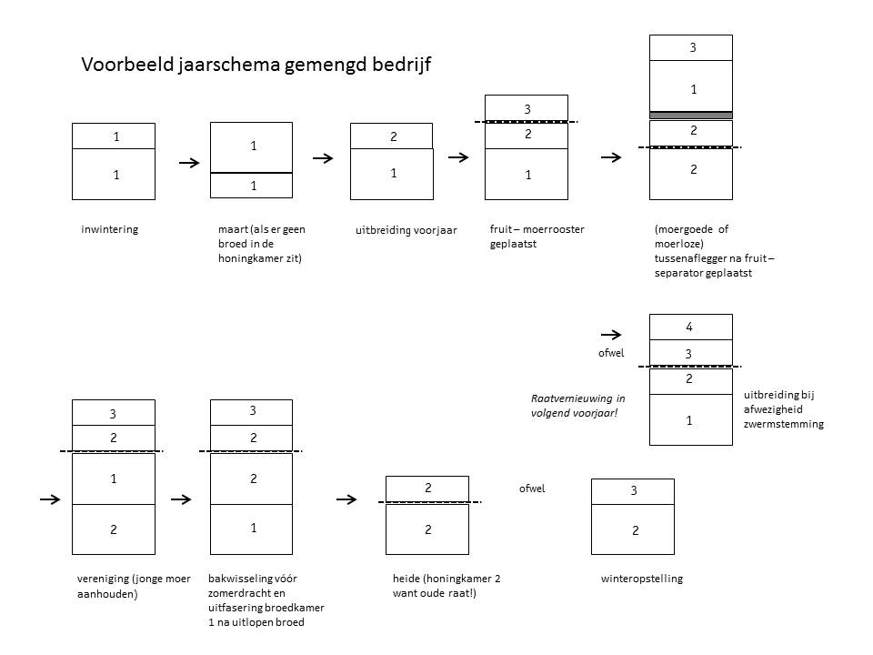 Voor de voornaamste stappen tijdens het seizoen verwijs ik naar de afbeelding. Er zijn, zoals altijd in de bijenhouderij, natuurlijk veel varianten mogelijk. In de winter staat de honingkamer boven de broedkamer. In de lente wissel ik de twee bakken om, tenminste als er nog geen broed in de bovenste bak zit. Dit stimuleert de bijen mogelijkerwijs enigszins tot ontwikkeling daar ze proberen deze voor hen onnatuurlijke constellatie met voorraad ónder het broed zo snel mogelijk te corrigeren. De met deze activiteit gepaard gaande warmteontwikkeling stimuleert dan mogelijk de broedaanzet. Na een reeks van eventuele kiepcontroles wordt soms (alsnog) een tussenaflegger gemaakt. Dit geeft de mogelijkheid (als uitbreiding van het aantal volken niet gewenst is) om oude raat te elimineren. Als er geen zwermstemming optreedt is de tussenaflegger niet noodzakelijk. In dat geval kan met één honingbak uitgebreid worden voor honingopslag. Voor diegenen die naar de heide gaan verdient het aanbeveling om de volken voor de tijd behoorlijk in te dikken en te voorzien van oude raat voor de honingopslag vanwege de moeilijke oogstbaarheid van heidehoning.
