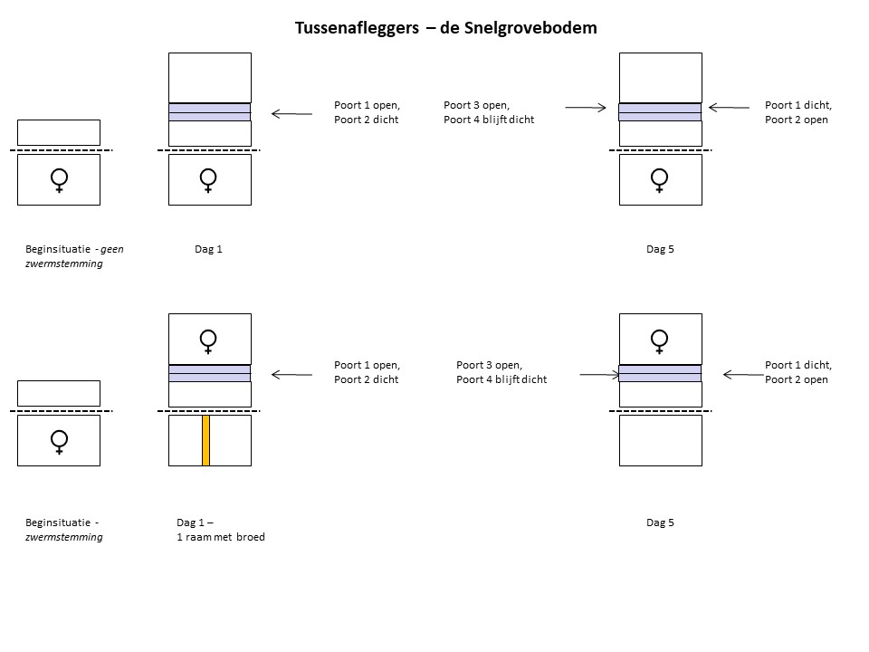 Als het volk in zwermstemming is zijn er steviger maatregelen nodig. De koningin wordt in de bovenste bak geplaatst, met het broed en de huisbijen. De vliegbijen vliegen af naar det onderste deel en zetten daar doppen aan op een meegegeven raam broed.
